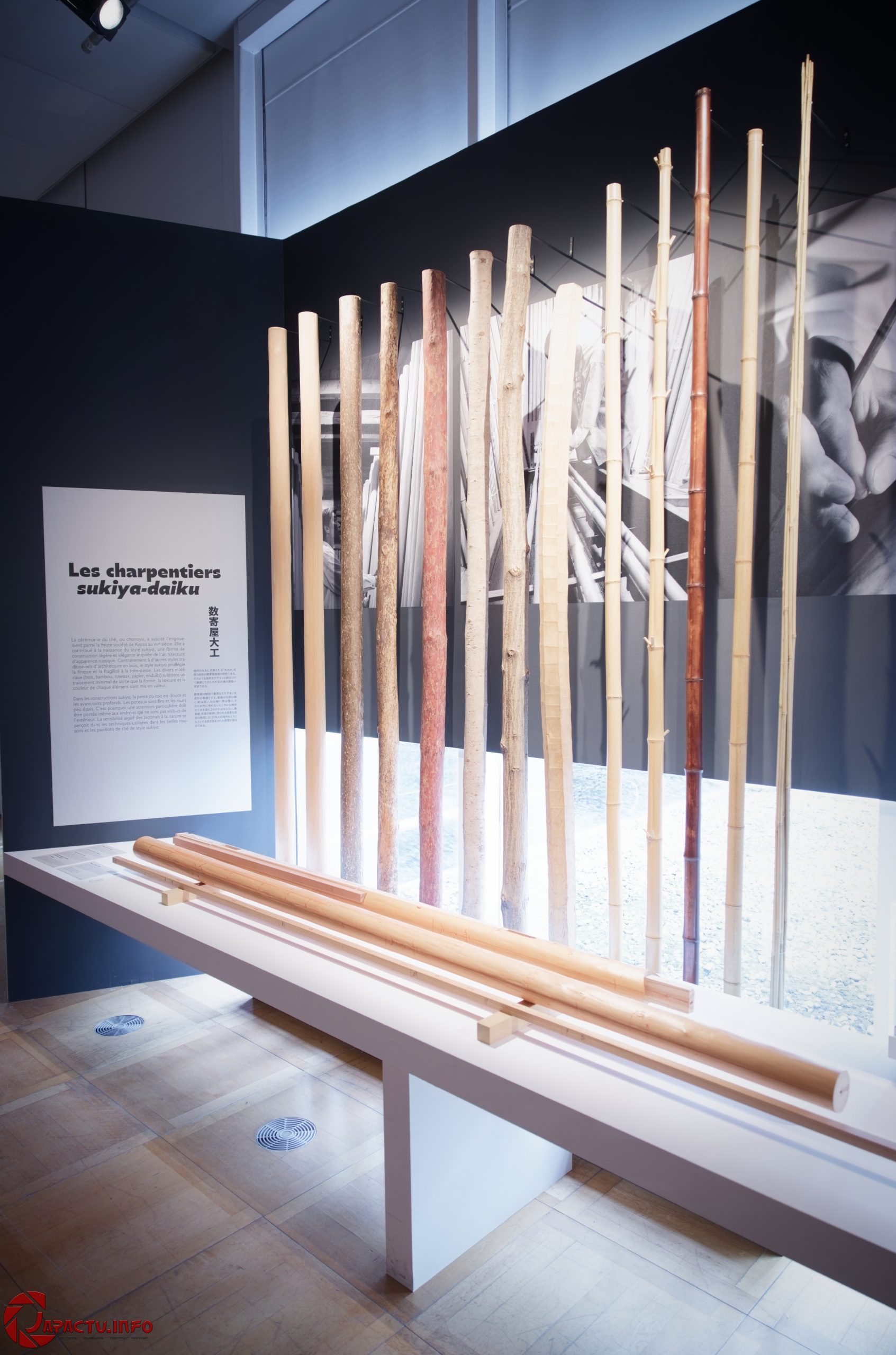 L’exposition présente les différentes étapes du travail du daiku (charpentier) : sa sélection minutieuse des bois (cyprès, cèdre, pin rouge…) ; l’utilisation d’une multitude d’outils – pour mesurer, marquer, couper ou encore raboter – dont le rôle est bien sûr essentiel ; les rituels shintô effectués en costumes de cérémonie pour s’attirer les faveurs des divinités lors de la construction. La dimension spirituelle est aussi évoquée au travers de l’architecture religieuse (temples bouddhiques et sanctuaires shintô) et des dômiya-daiku, charpentiers spécialisés dans ce type de construction. Une autre facette de l’architecture traditionnelle est illustrée par une reconstitution grandeur nature du Sa-an, un célèbre pavillon de thé conçu en 1742, qui fait partie du complexe du temple Daitoku-ji à Kyoto. Cette structure est typique du style sukiya, né au XVIe siècle avec l’engouement pour la cérémonie du thé parmi l’aristocratie. Elle témoigne du savoir-faire des charpentiers japonais et de la beauté d’une architecture d’apparence rustique, mais à la conception étonnamment complexe.