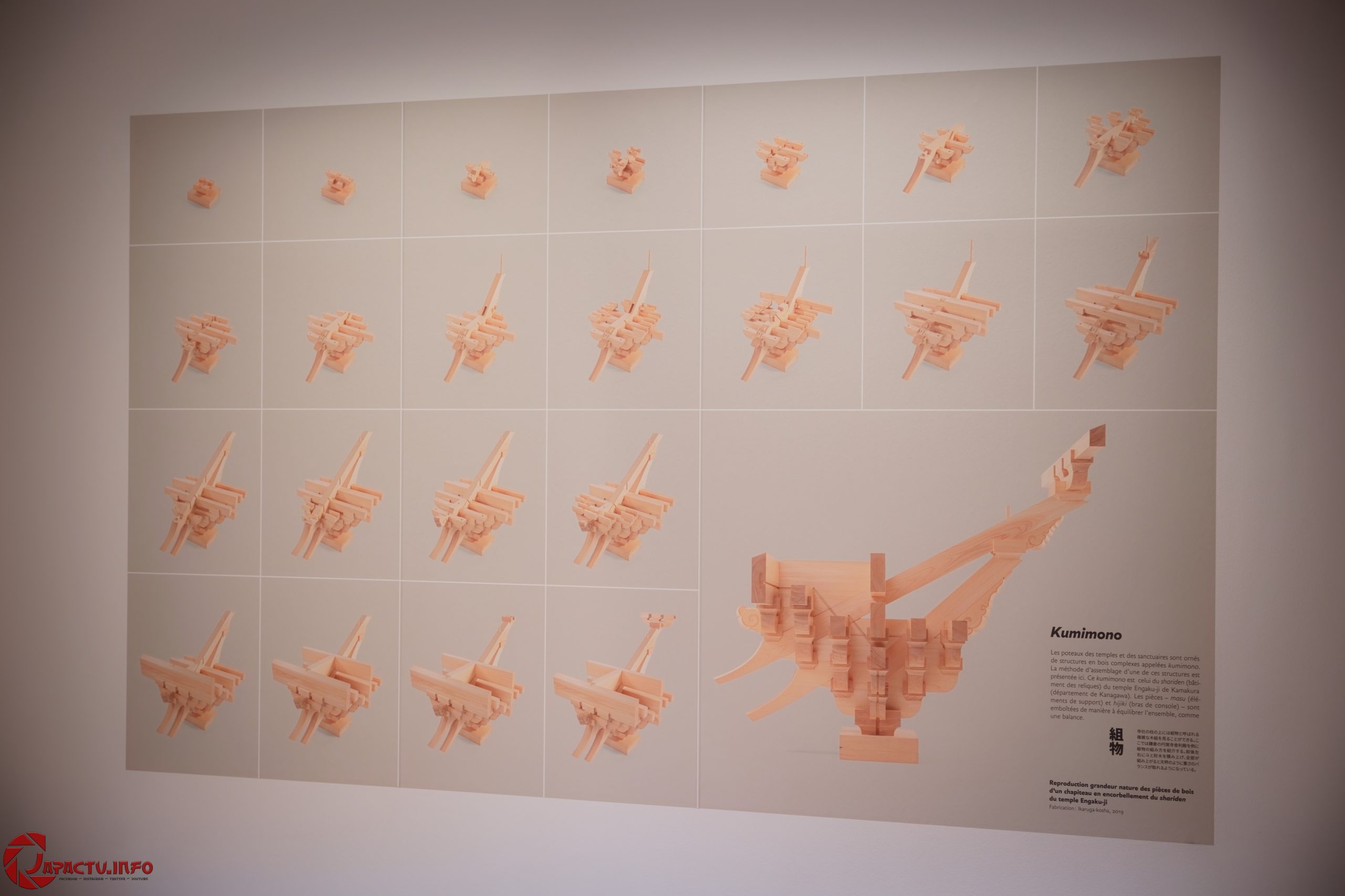 Enfin, l’exposition révèle au public la technique des kigumi. Ces assemblages de pièces de bois sans clous ni vis ont une multitude de formes, parfois très sophistiquées, qui répondent à des fonctions diverses et sont emblématiques de l’ingéniosité des charpentiers japonais.
