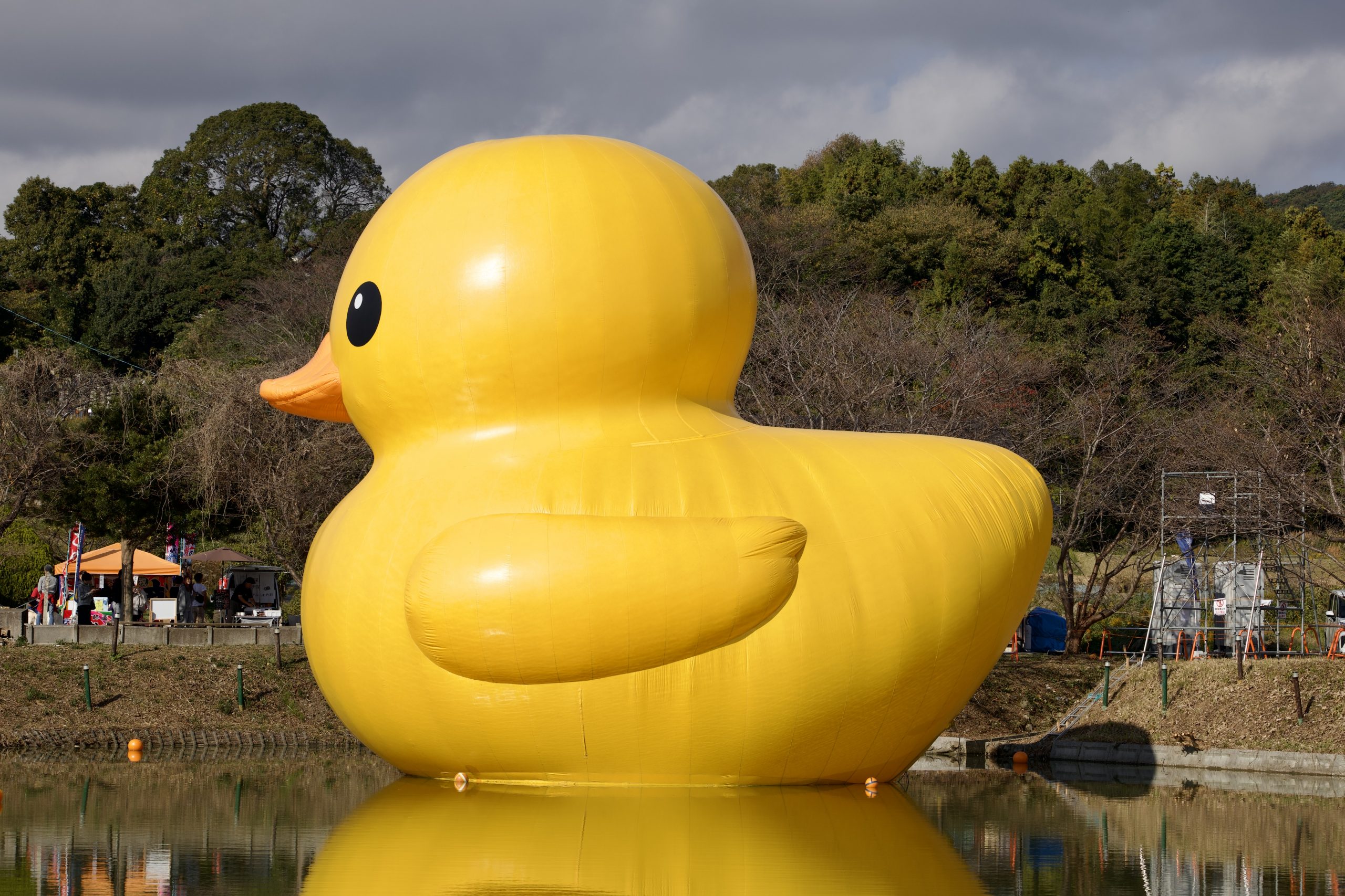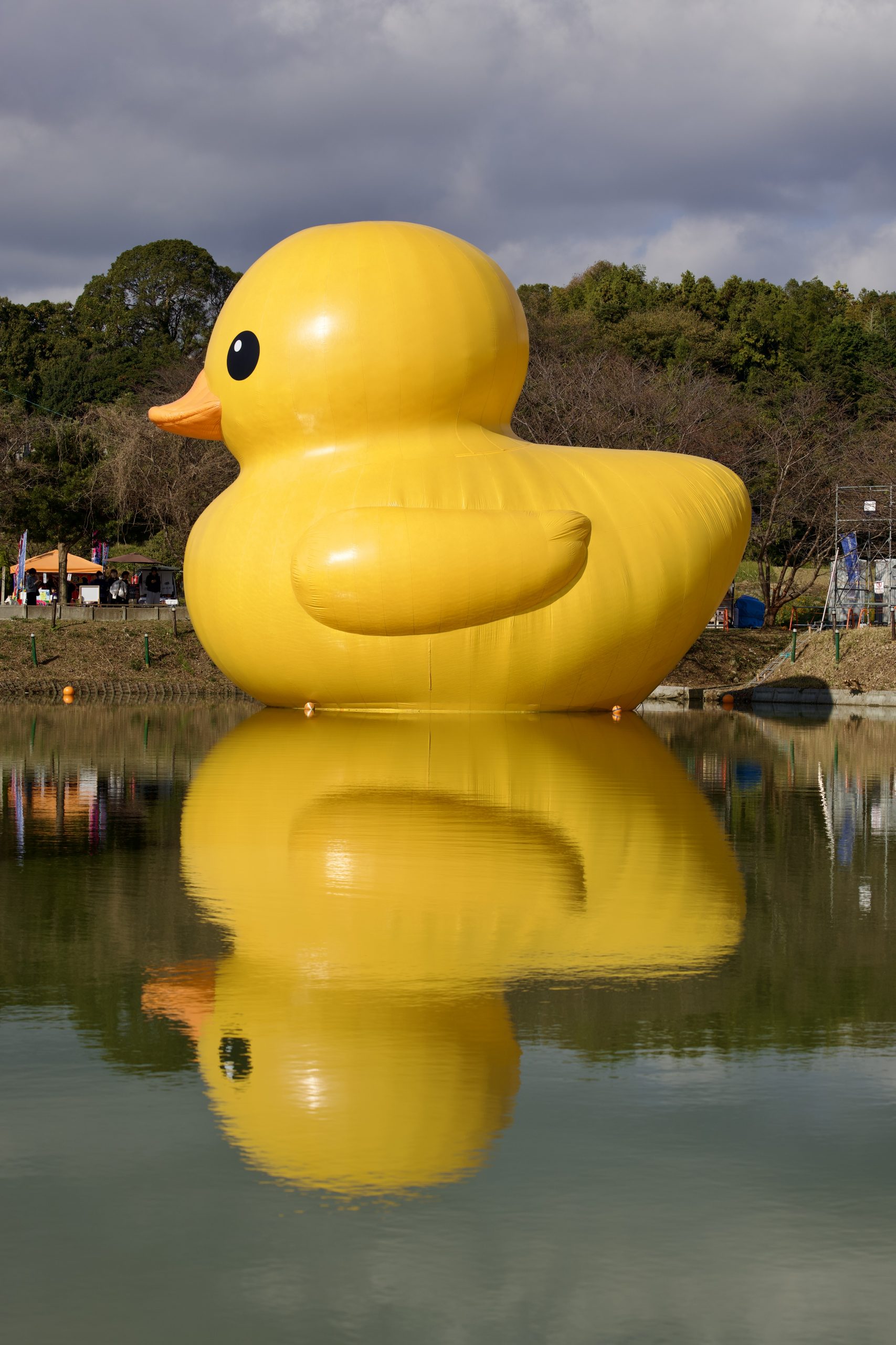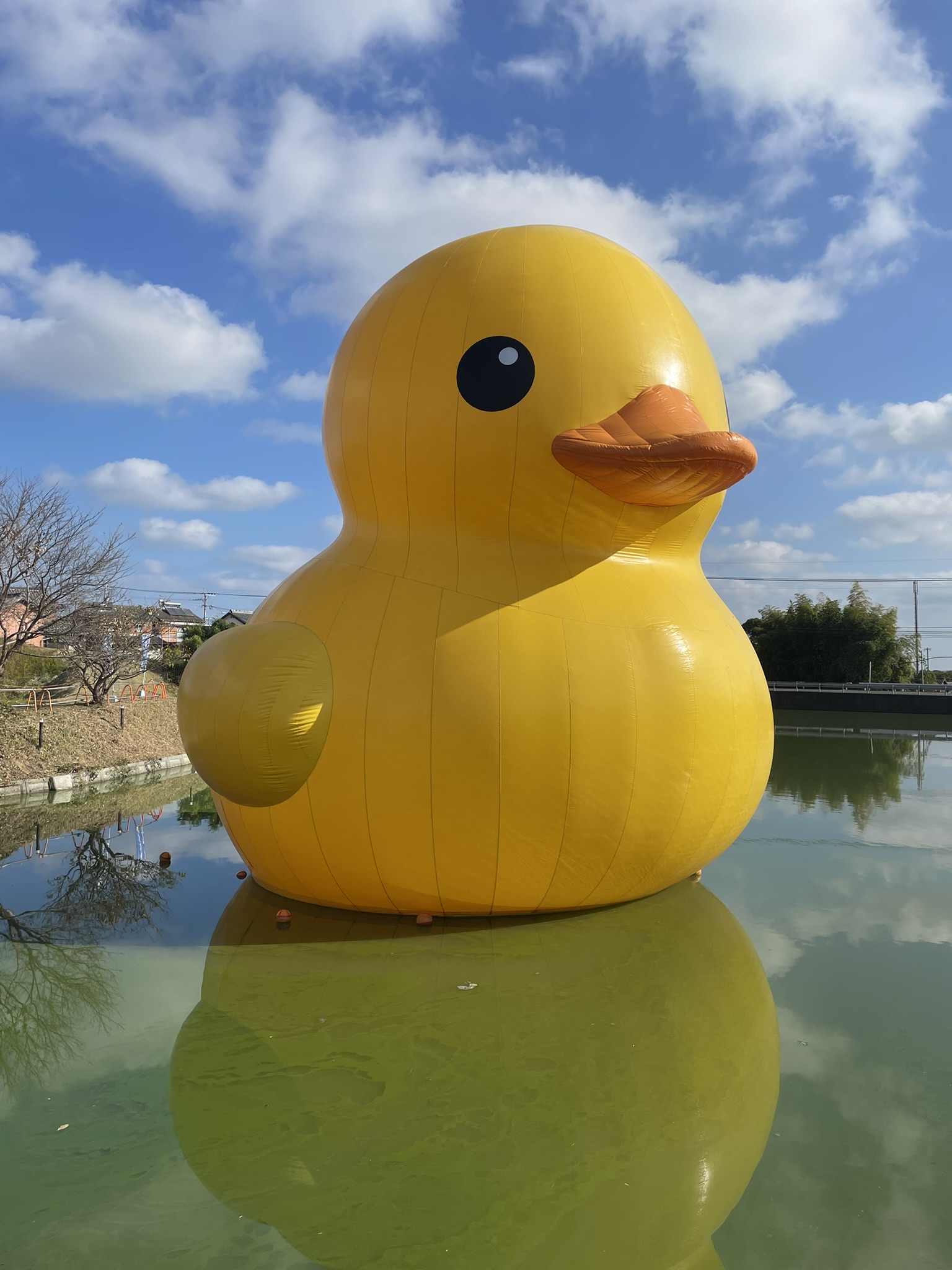 Ce matin encore, les habitants et visiteurs de Kunisaki ont levé les yeux avec un sourire étonné : au milieu d’un paisible plan d’eau, un immense canard jaune gonflable flotte tranquillement, comme un visiteur venu d’un univers parallèle. L’installation, à la fois ludique et monumentale, bouleverse le paysage habituel et insuffle une touche de poésie au cœur de la ville.