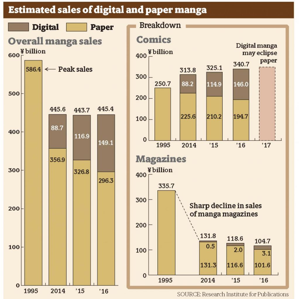 Both paper comics and magazines are falling but the “The decline of paper manga magazines is quite severe,” Mizuno said.