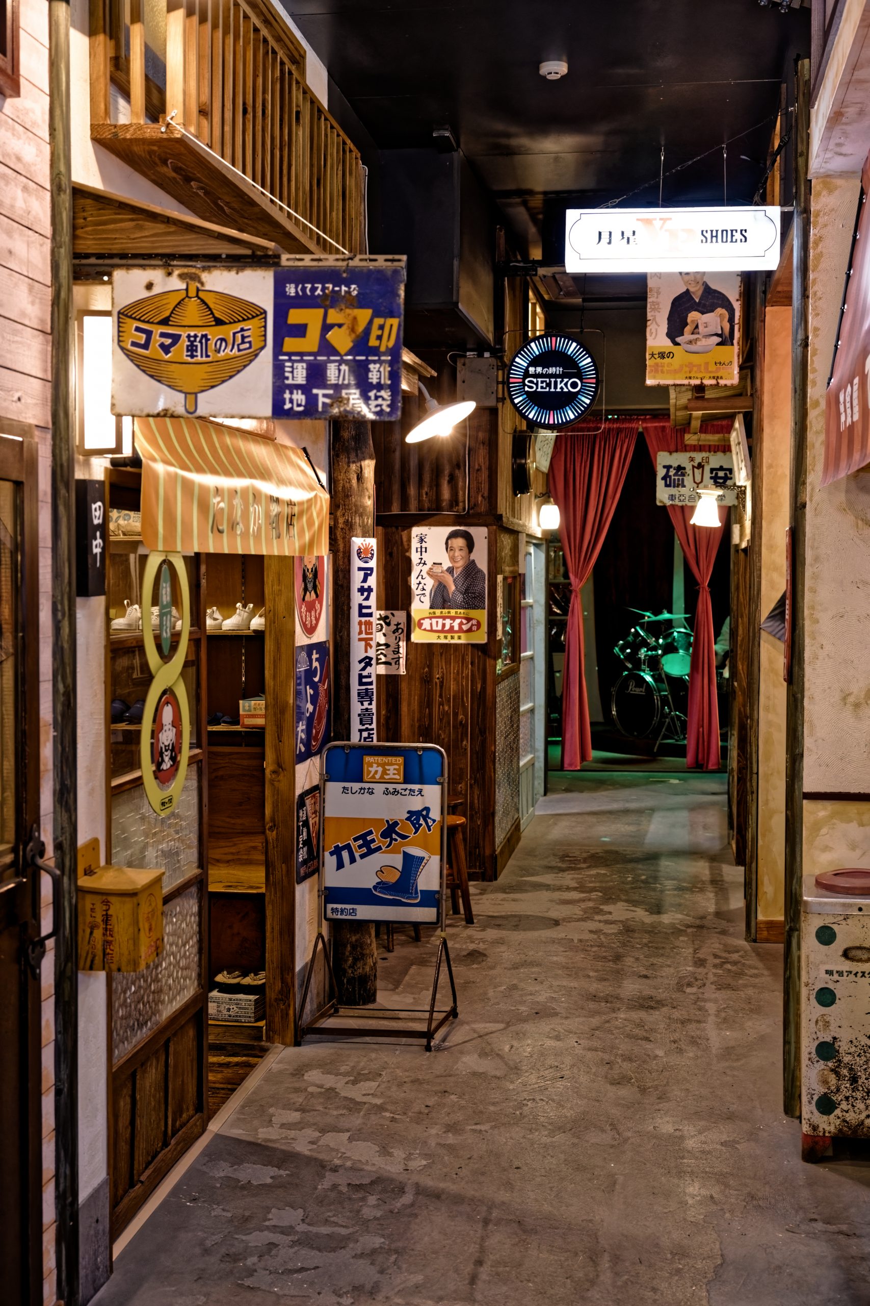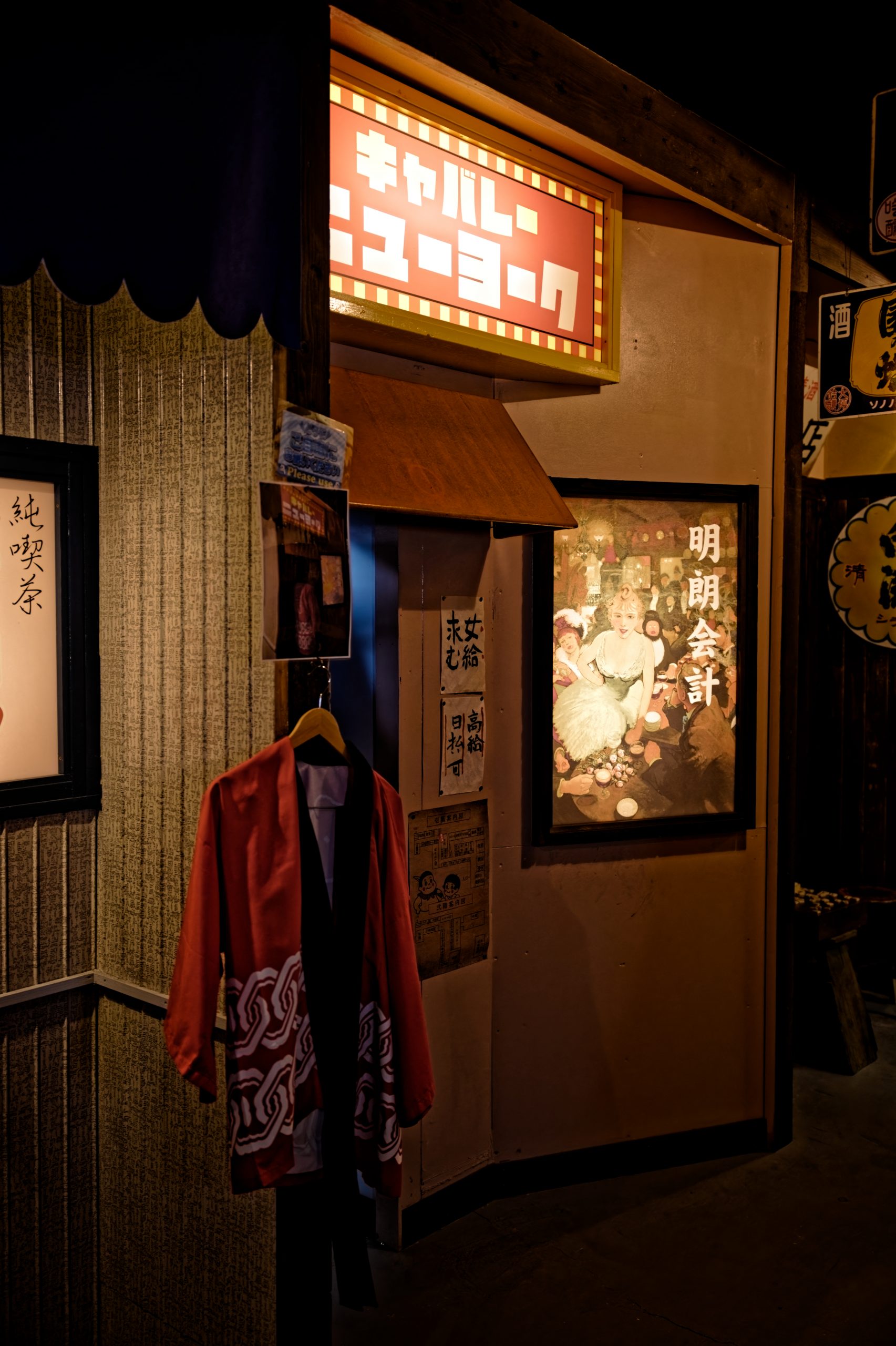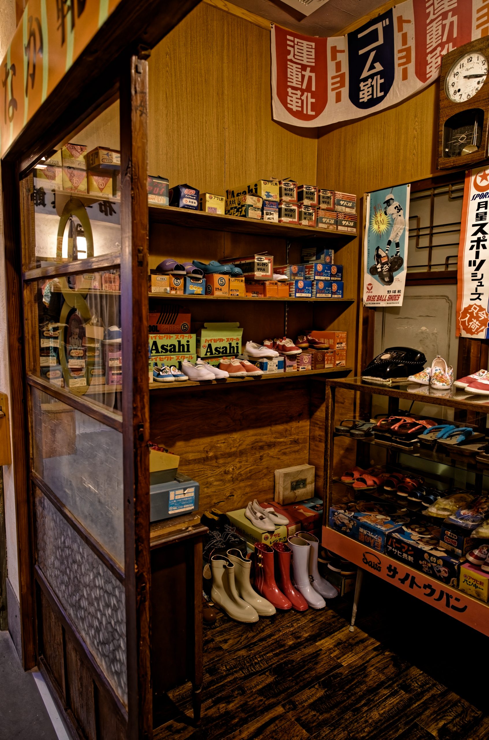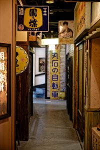Dès l’entrée, le visiteur quitte le présent pour pénétrer dans un décor qui semble tout droit sorti d’un film. Les ruelles reconstituées, bordées de façades anciennes et d’enseignes rétro, recréent l’ambiance des petites villes japonaises des années 1950 à 1970. Ici, chaque boutique, chaque vitrine et chaque objet racontent une histoire. Une petite échoppe de bonbons traditionnels expose des friandises colorées qui faisaient le bonheur des enfants de l’époque, tandis qu’un salon de coiffure d’un autre temps conserve ses fauteuils métalliques et ses miroirs patinés par les années. Plus loin, une salle de classe d’école primaire rappelle le quotidien des élèves japonais, avec ses pupitres en bois, ses affiches pédagogiques et ses objets d’apprentissage.